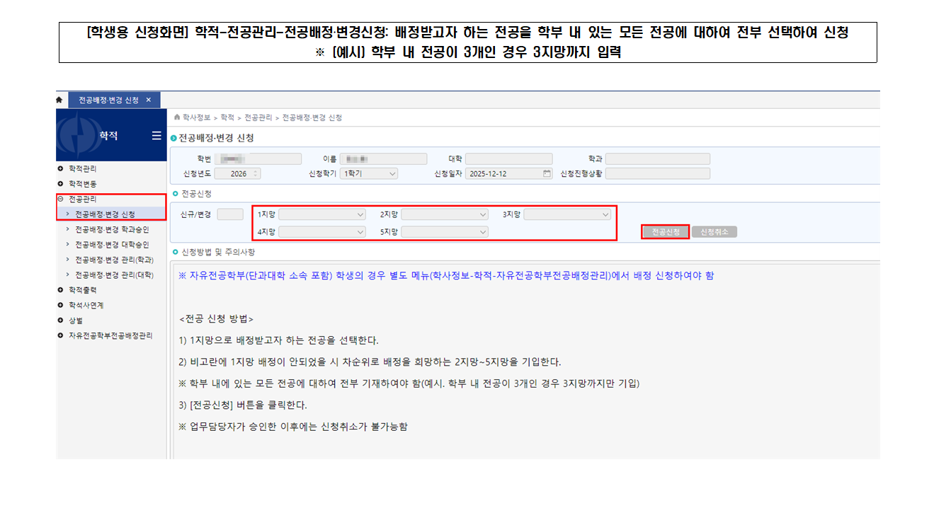 가. 대상: 2025학년도 모집단위 학부 입학생, 전공 미배정생, 전공변경 희망생 등(자유전공학부 제외) 나. 추진 일정: 전공배정 및 변경 신청 2025.12.15.(월) ~ 12.31.(수) |